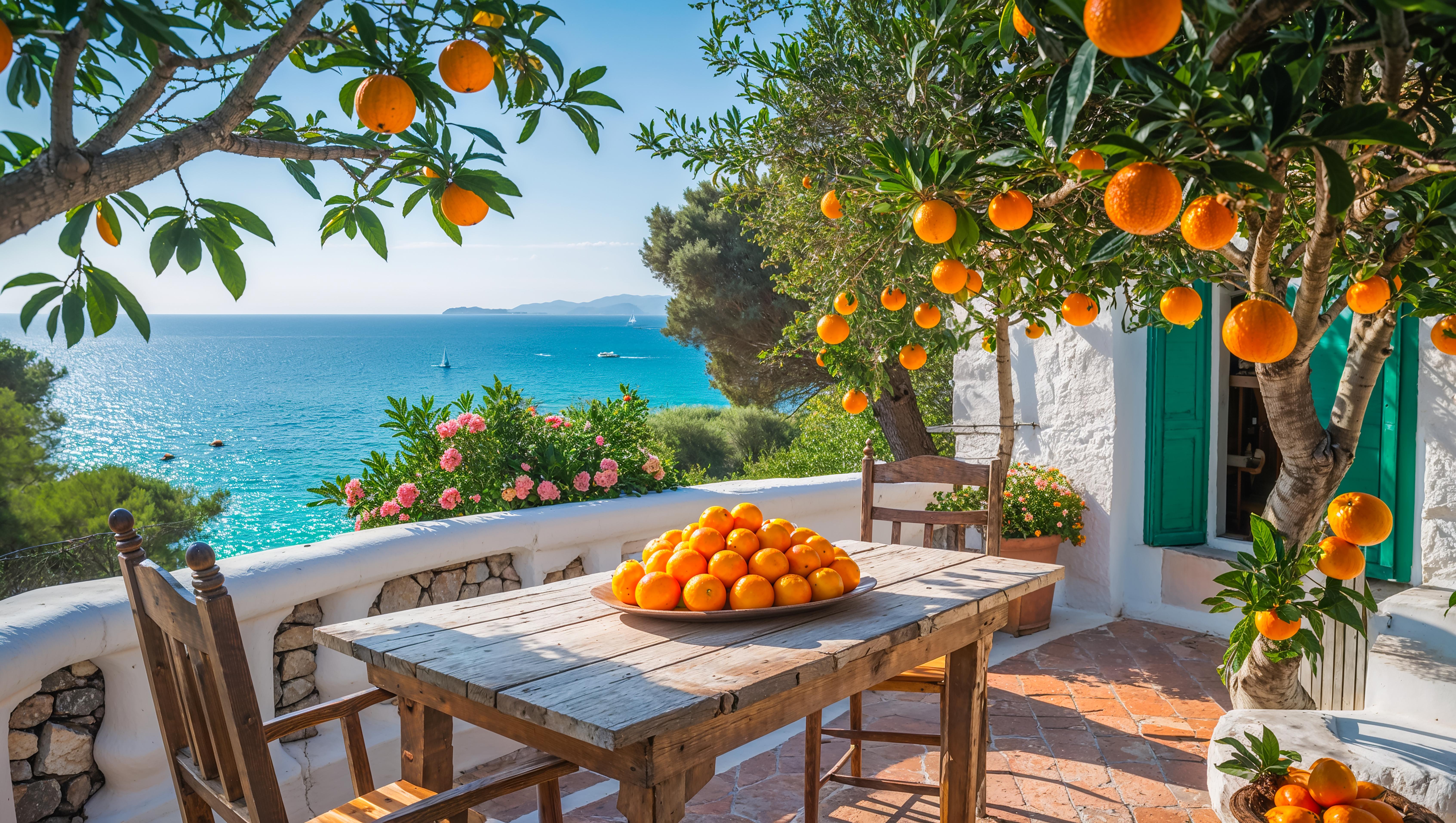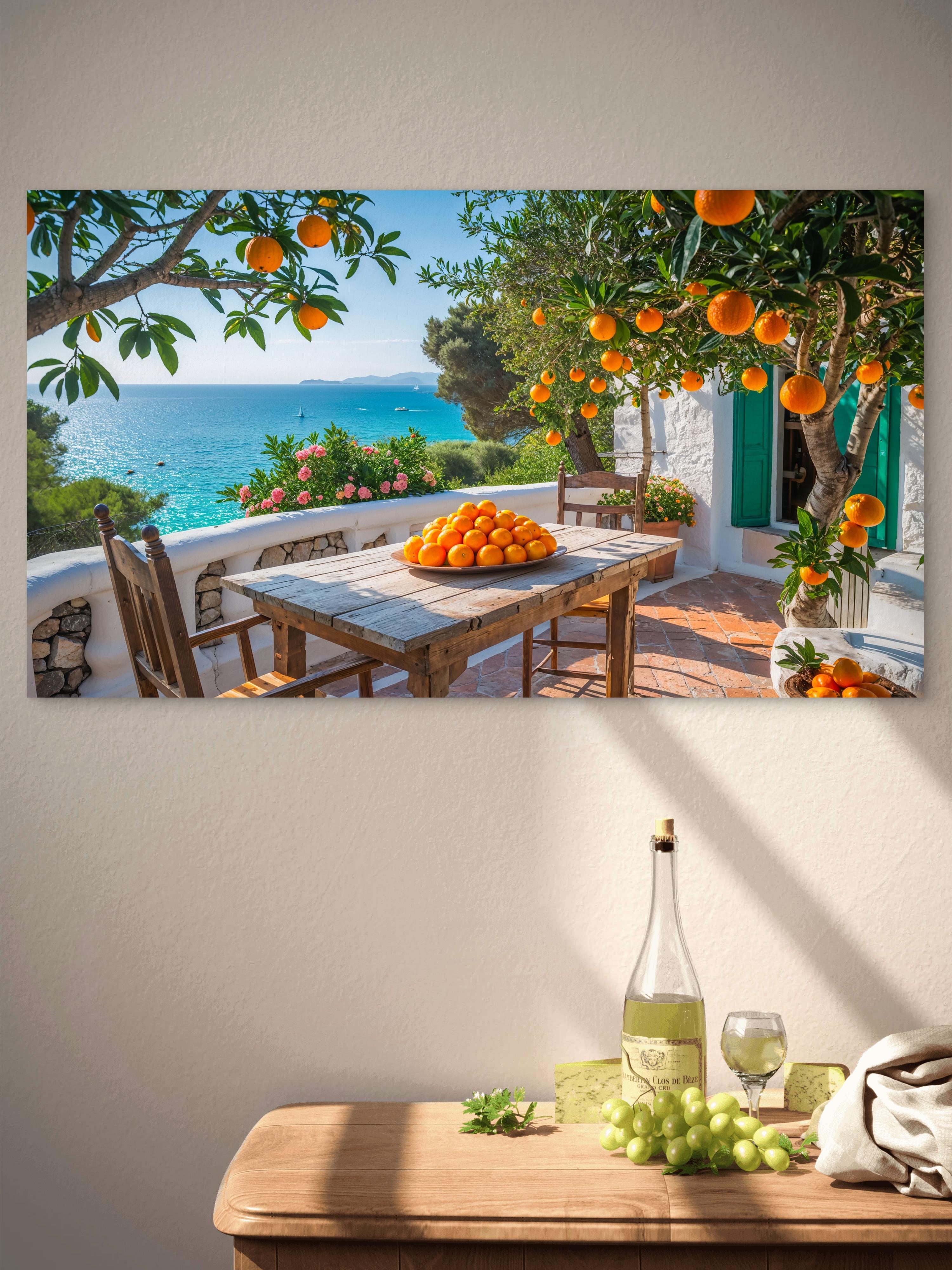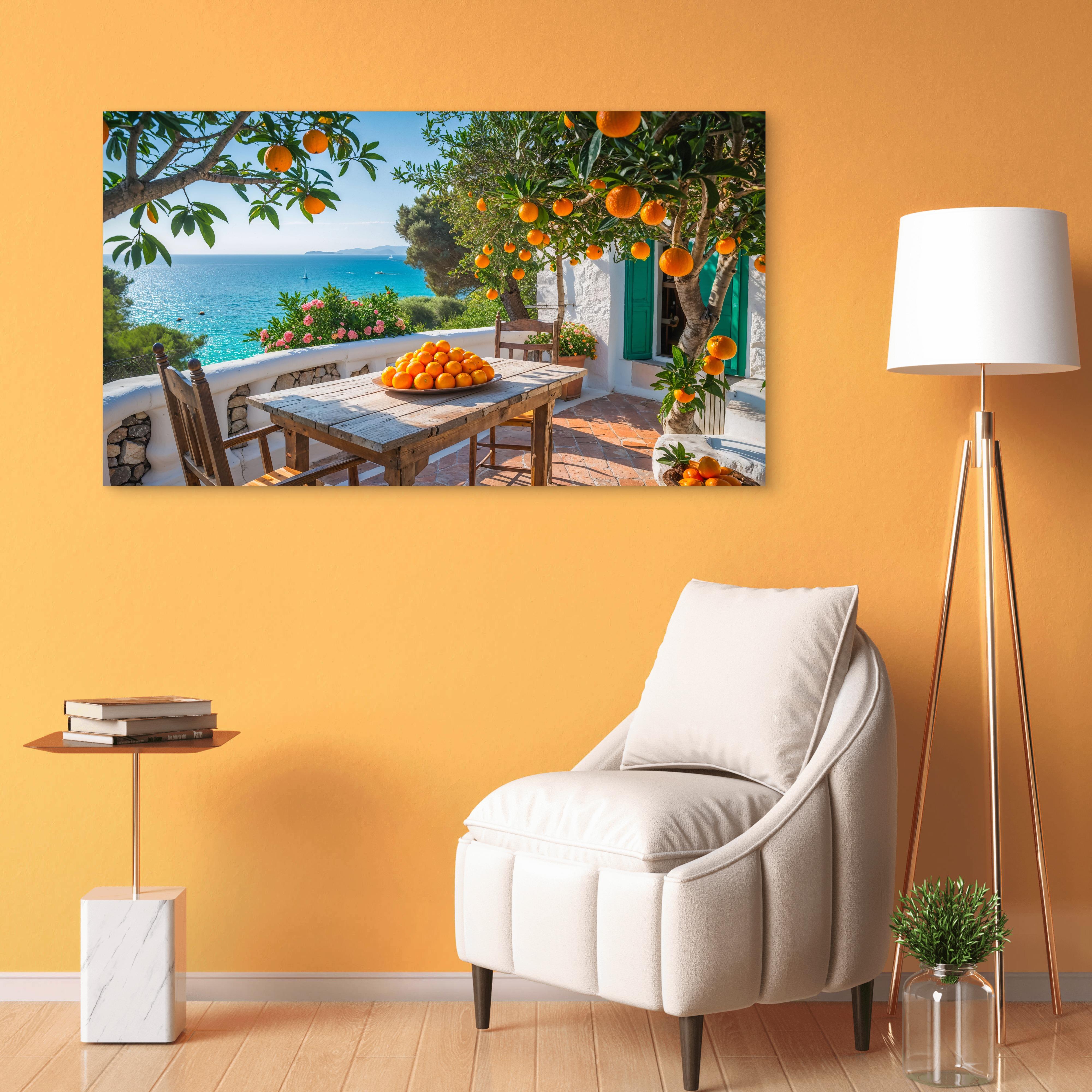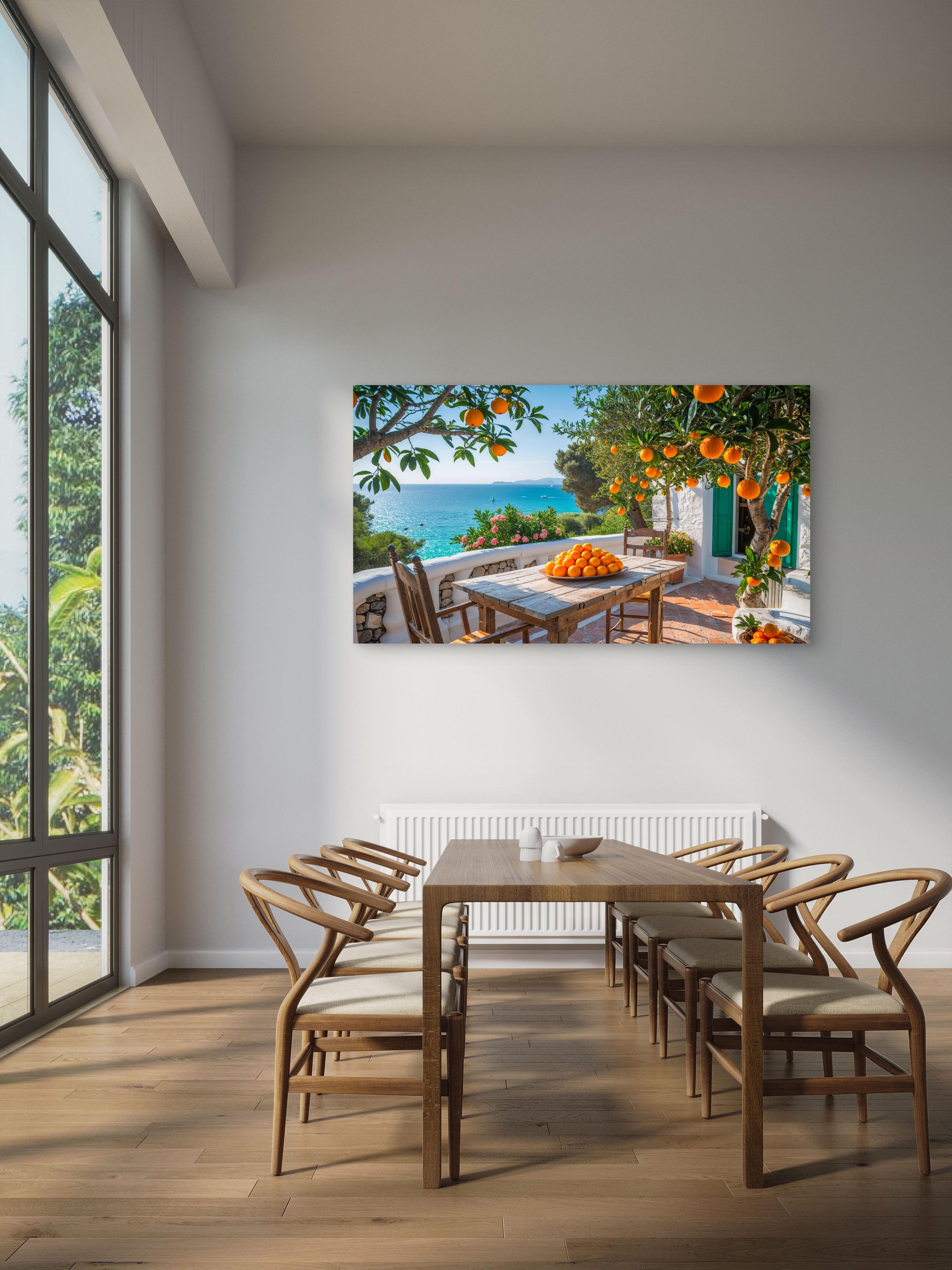 Bring the refreshing peace of an endless summer day and the tranquility of the Mediterranean right onto your walls with this vibrant glass art. The piece combines lively orange trees, a rustic patio, and the brilliant turquoise of the sea, creating a heartwarming and inviting atmosphere. It is the perfect cheerful and natural focal point for your kitchen, dining area, or living room.