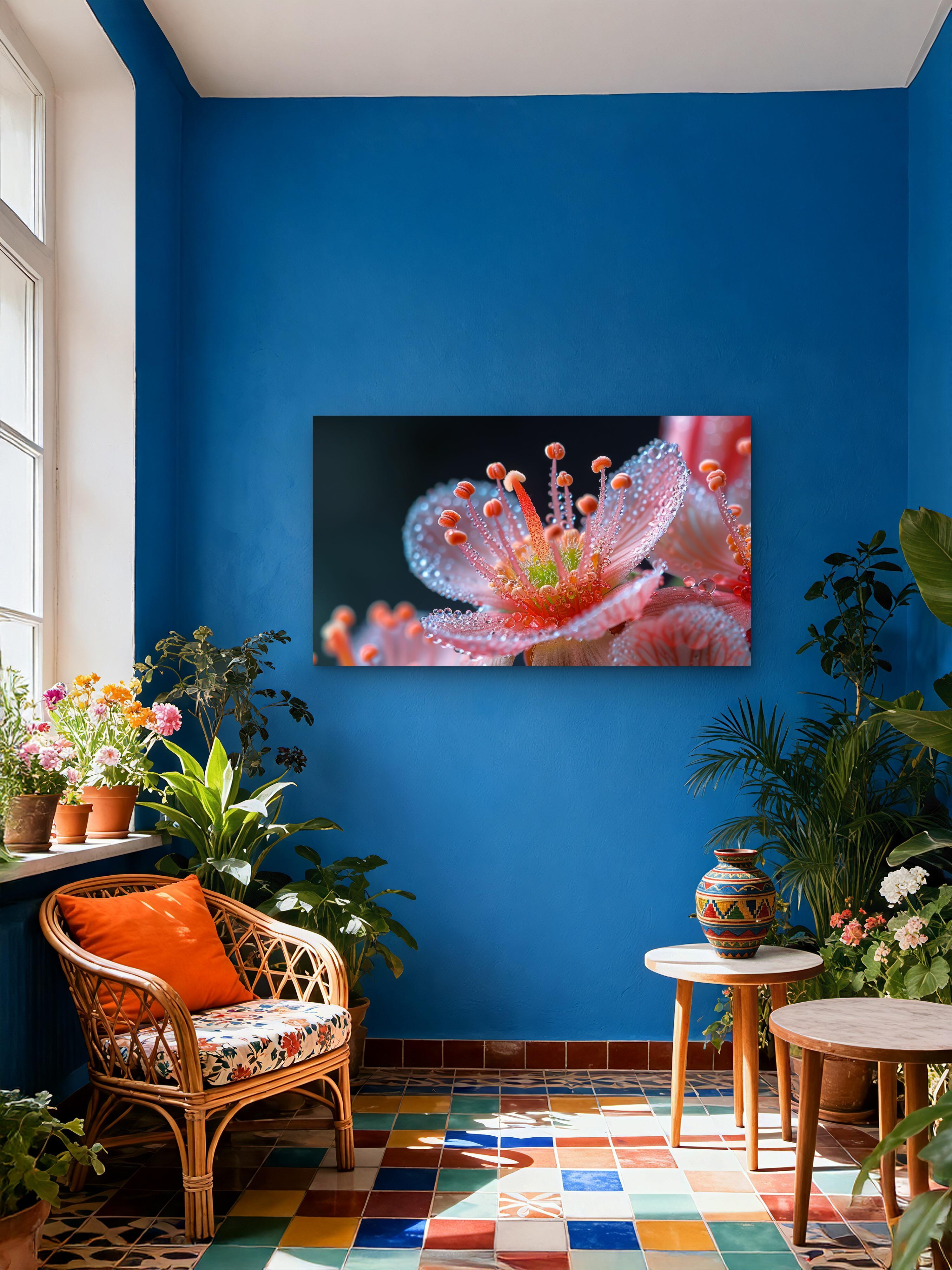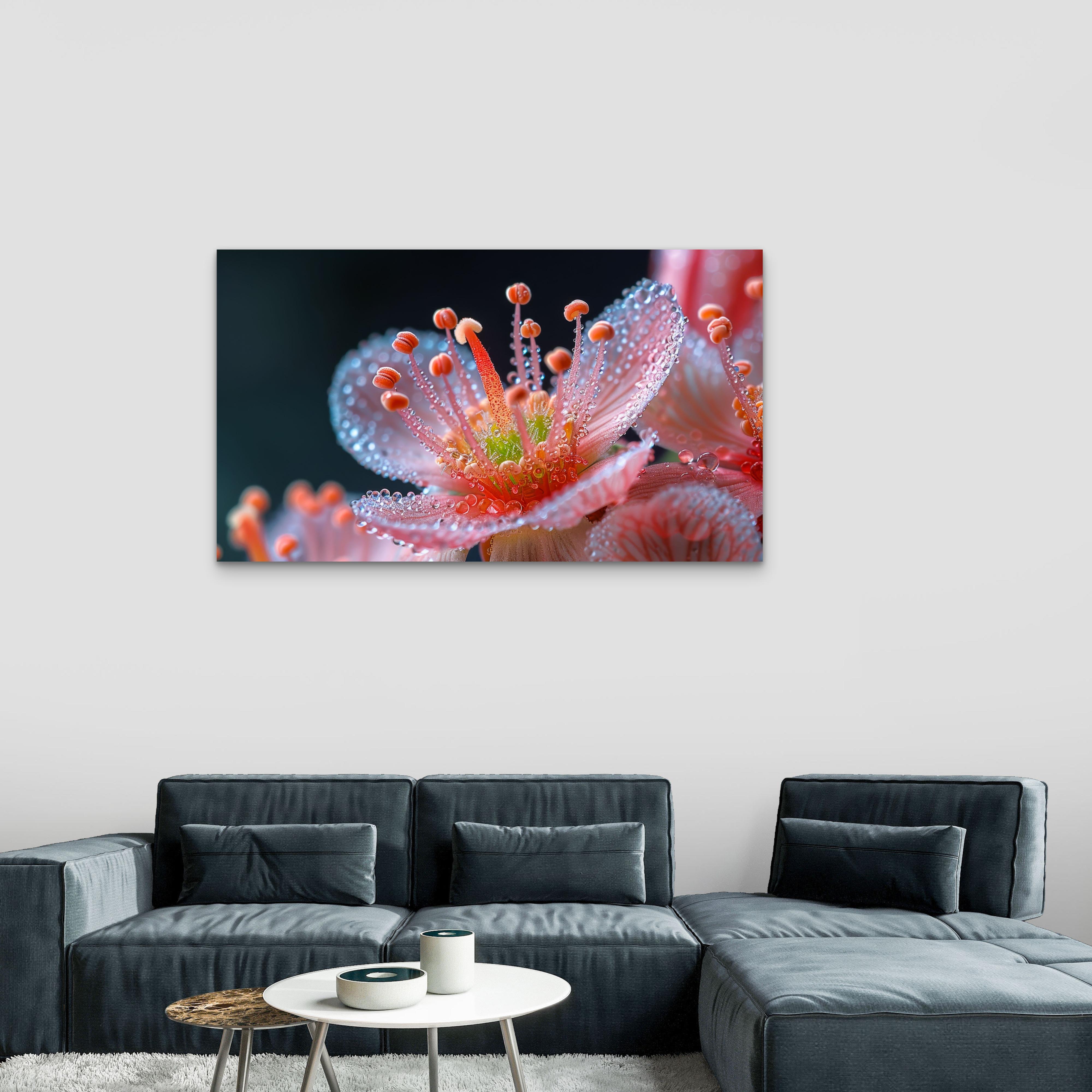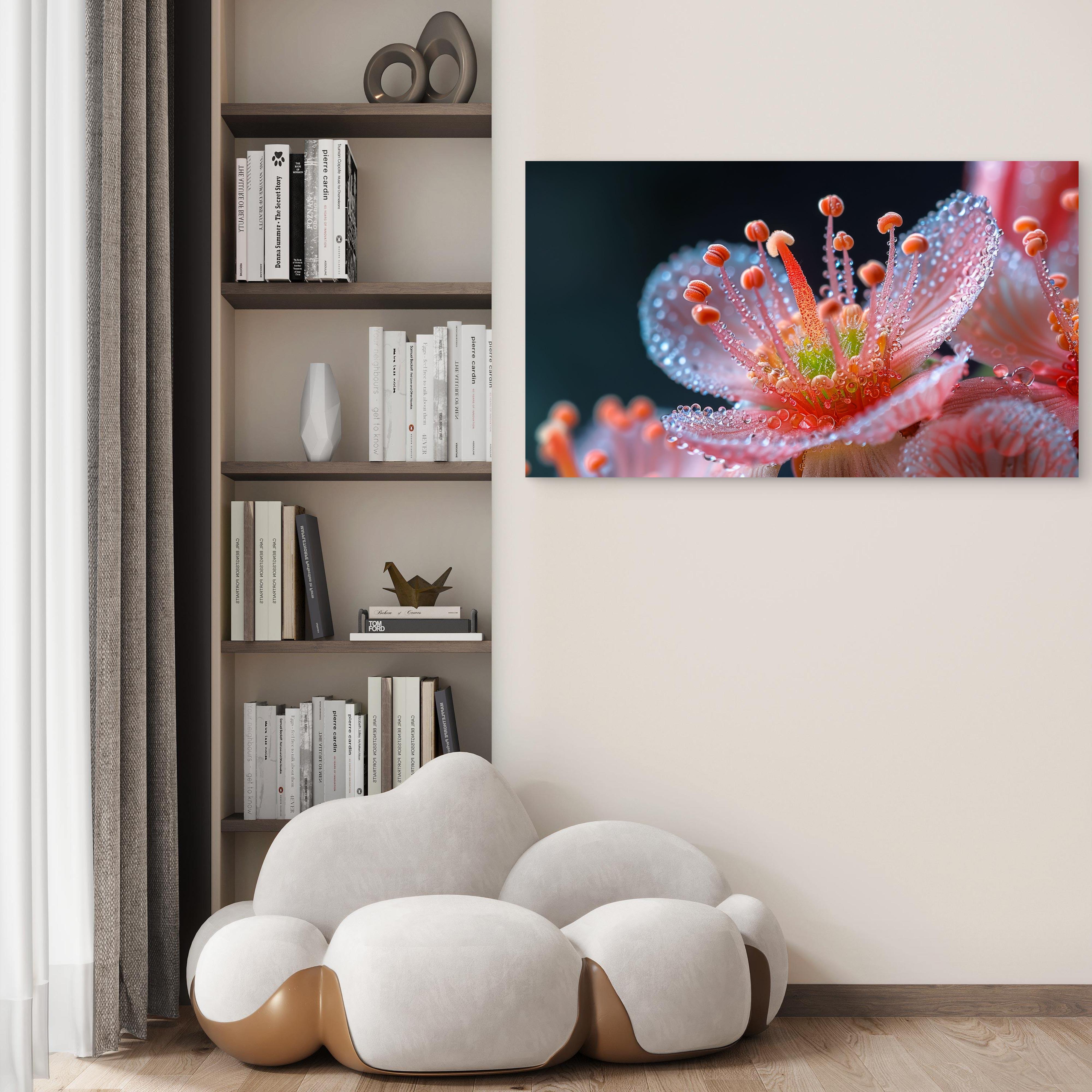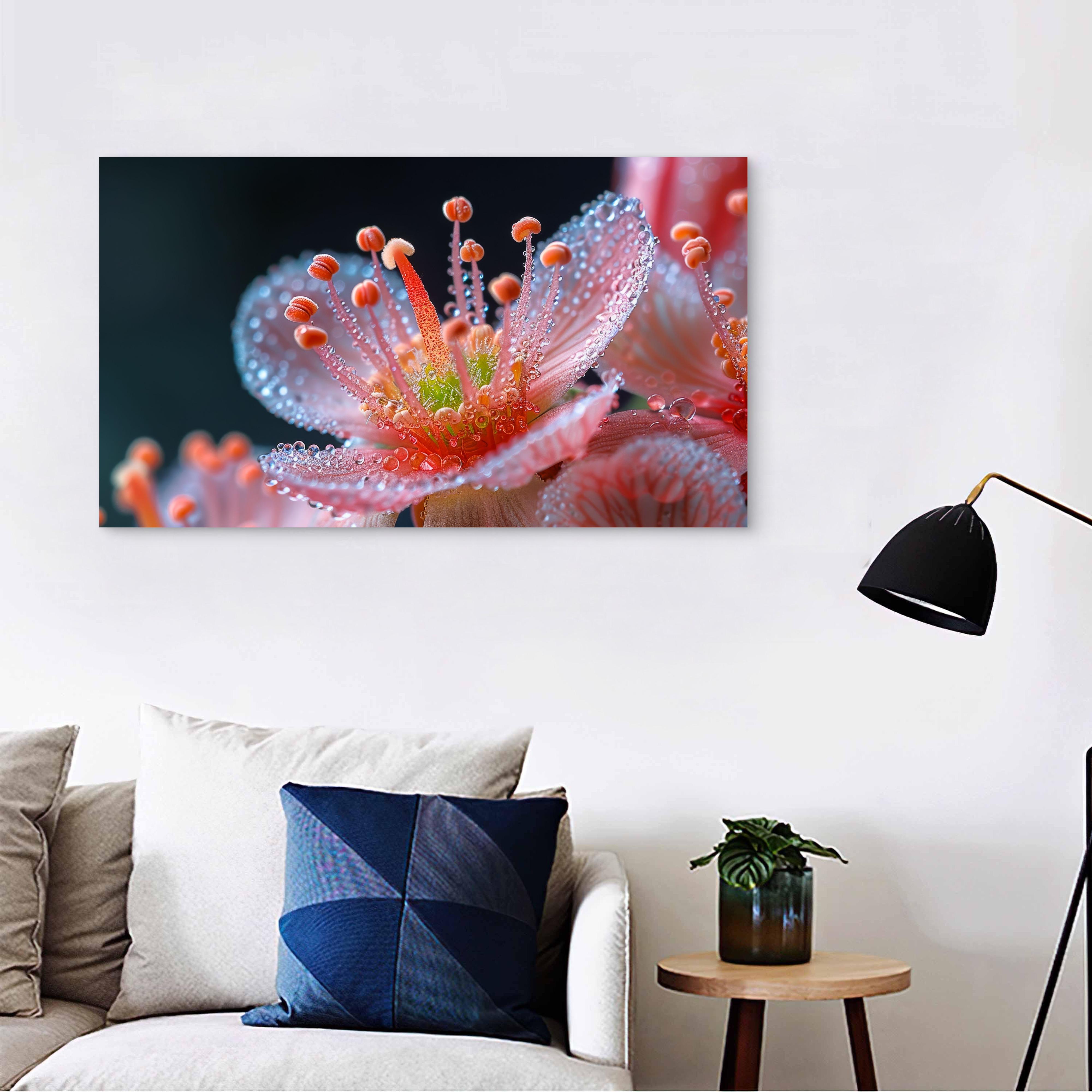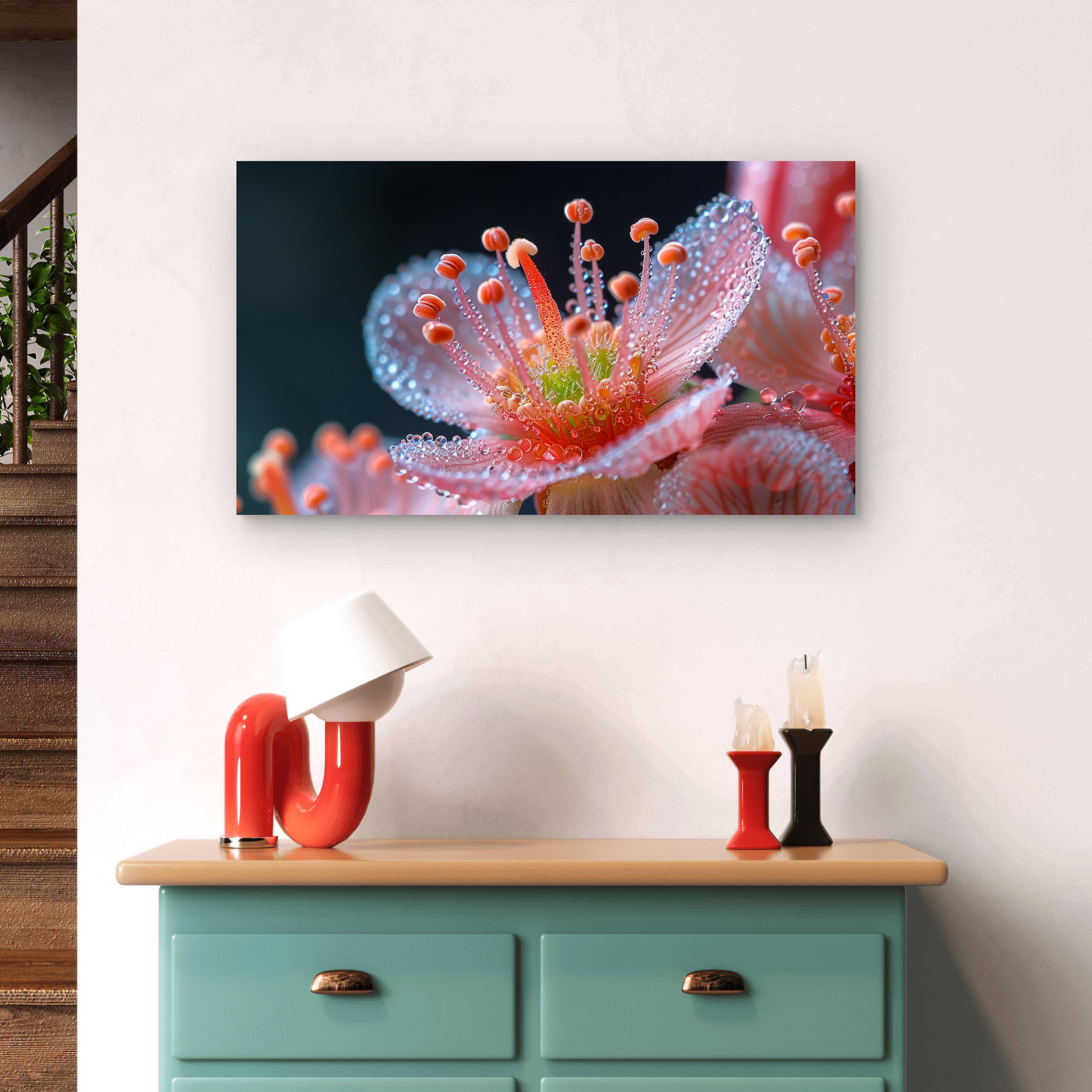 This stunning tempered glass wall art captures the mesmerizing beauty of a pink flower with delicate dew drops in breathtaking macro detail. Printed using high-resolution UV technology, the artwork reflects light beautifully, creating a vivid and modern aesthetic in any space.