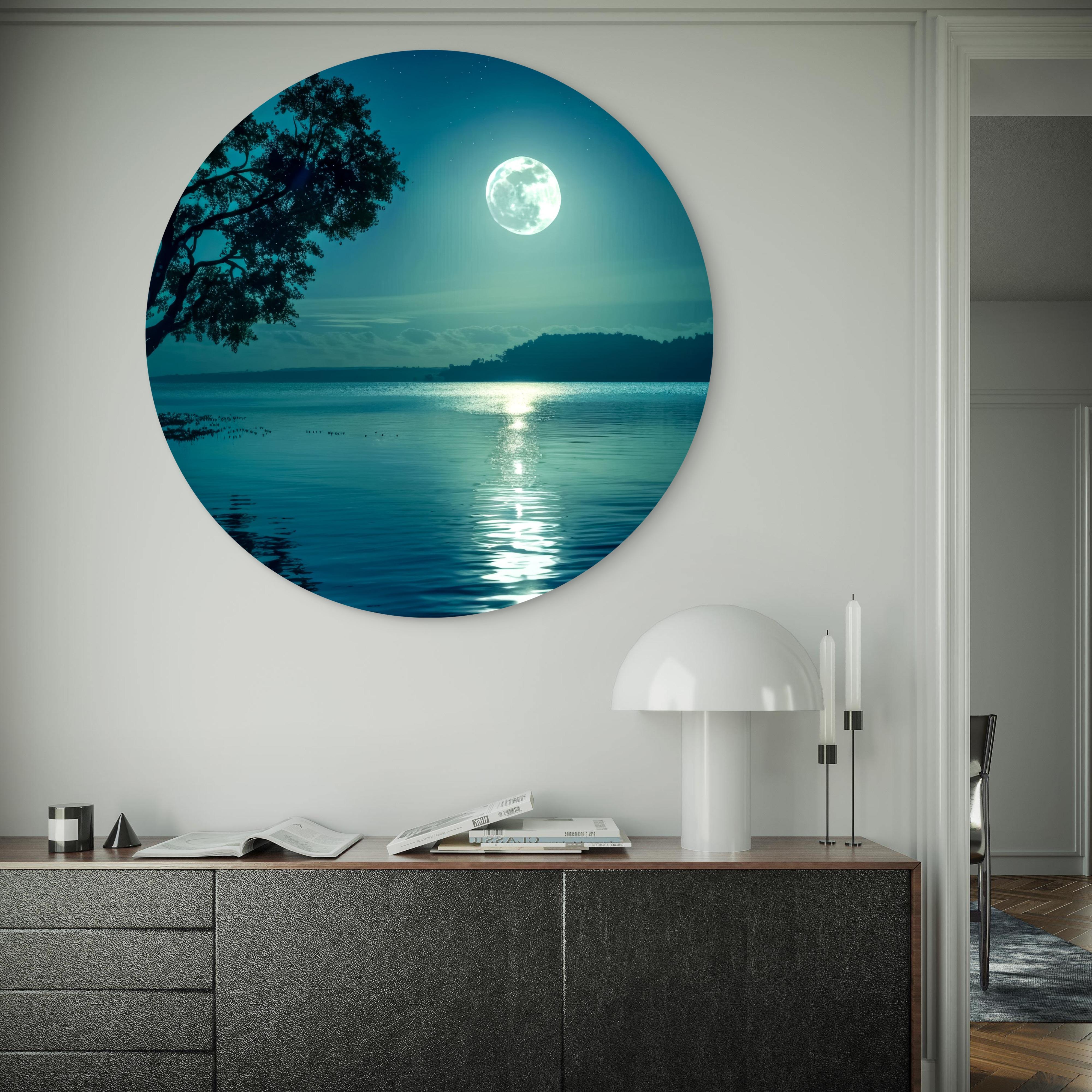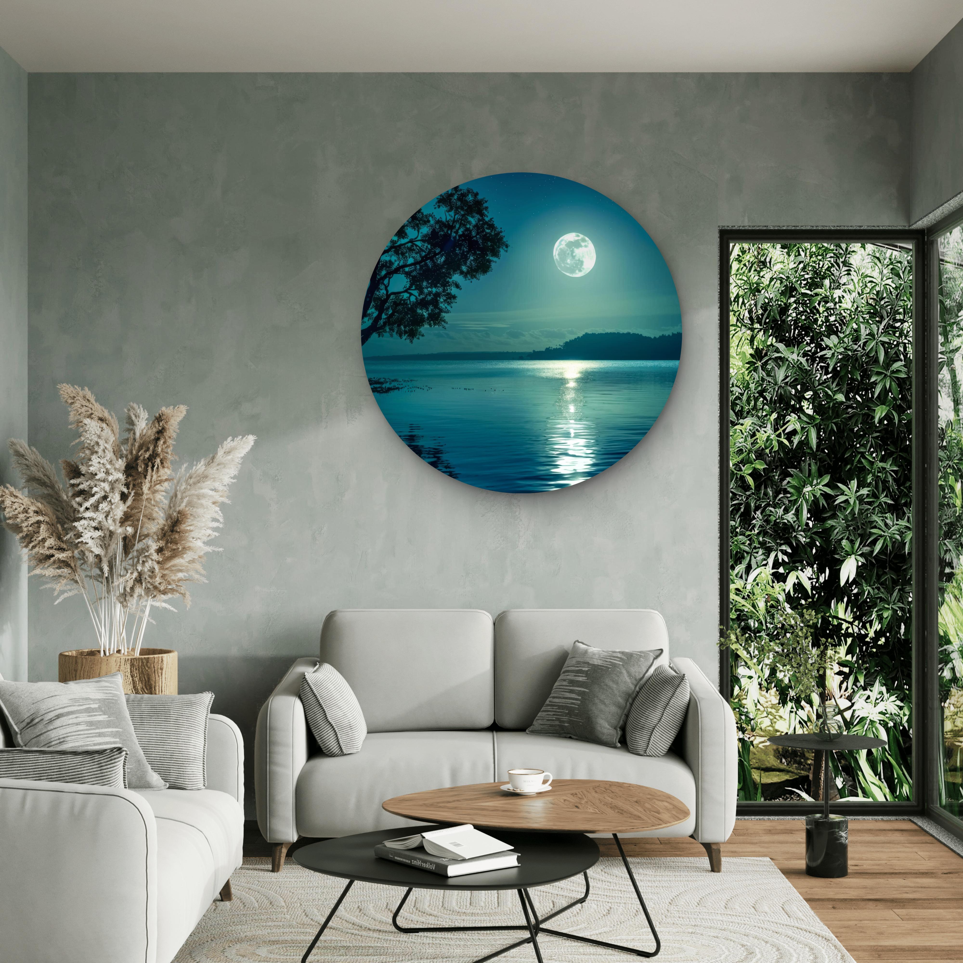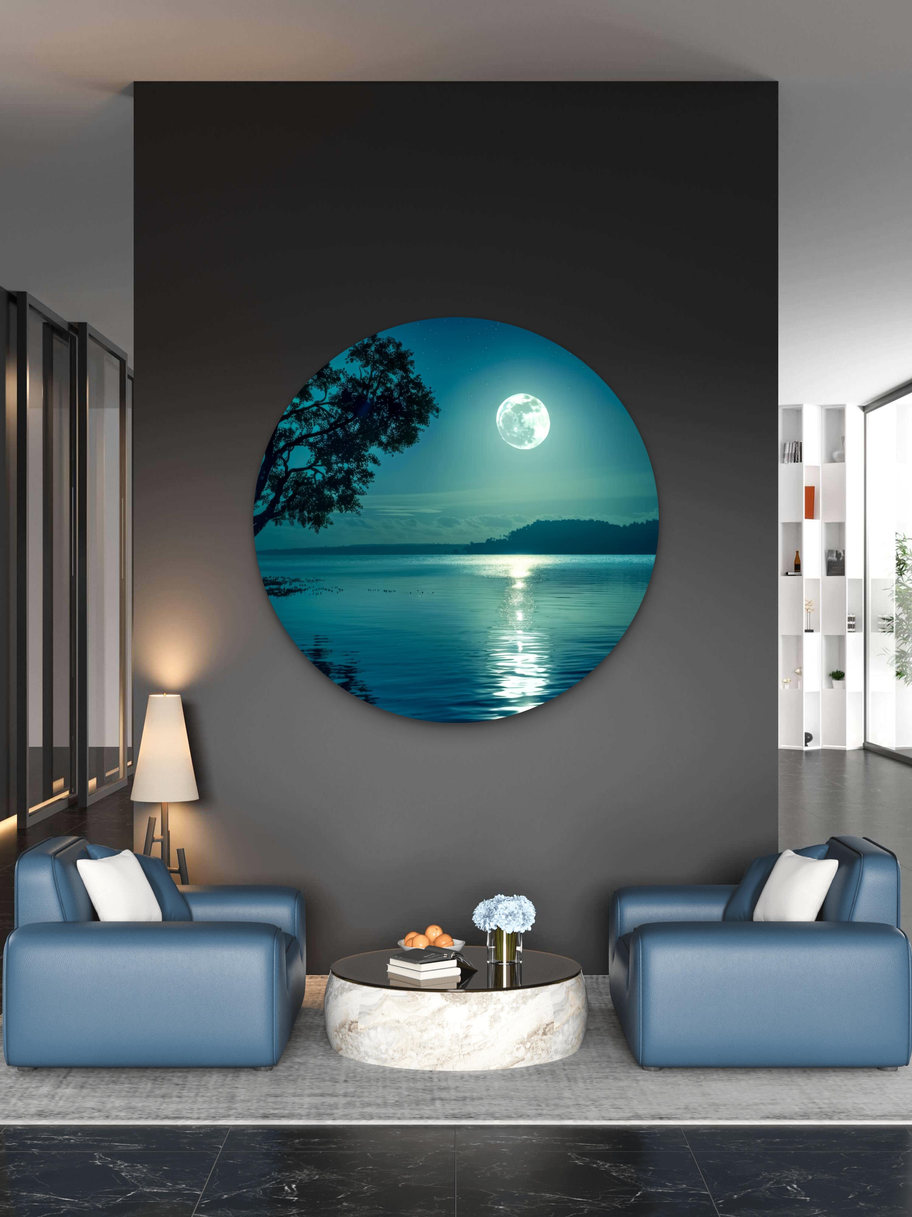 This captivating round tempered glass wall art brings the calm and mystery of the night into your home. The reflection of the bright moonlight over the peaceful lake adds a sense of depth and tranquility to any space. Its modern design offers both simplicity and elegance, making it a perfect addition to contemporary interiors.